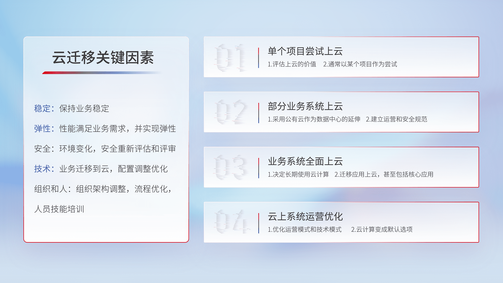 结合实际业务,,,,从规划设计、、云平台选型、、、、云原生改造、、、数据迁移、、、、集成交付,,,,迁移全过程为客户识别最佳上云路径,,,做好风险识别管理,,,设计网络架构、、、身份权限、、、安全审计合规、、、操作审计、、、日志审计、、监控告警策略、、、多站点容灾设计等,,,对云上基础设施进行整体规划,,提升IT治理水平,,以满足弹性、、高可用、、高性能的需求。。