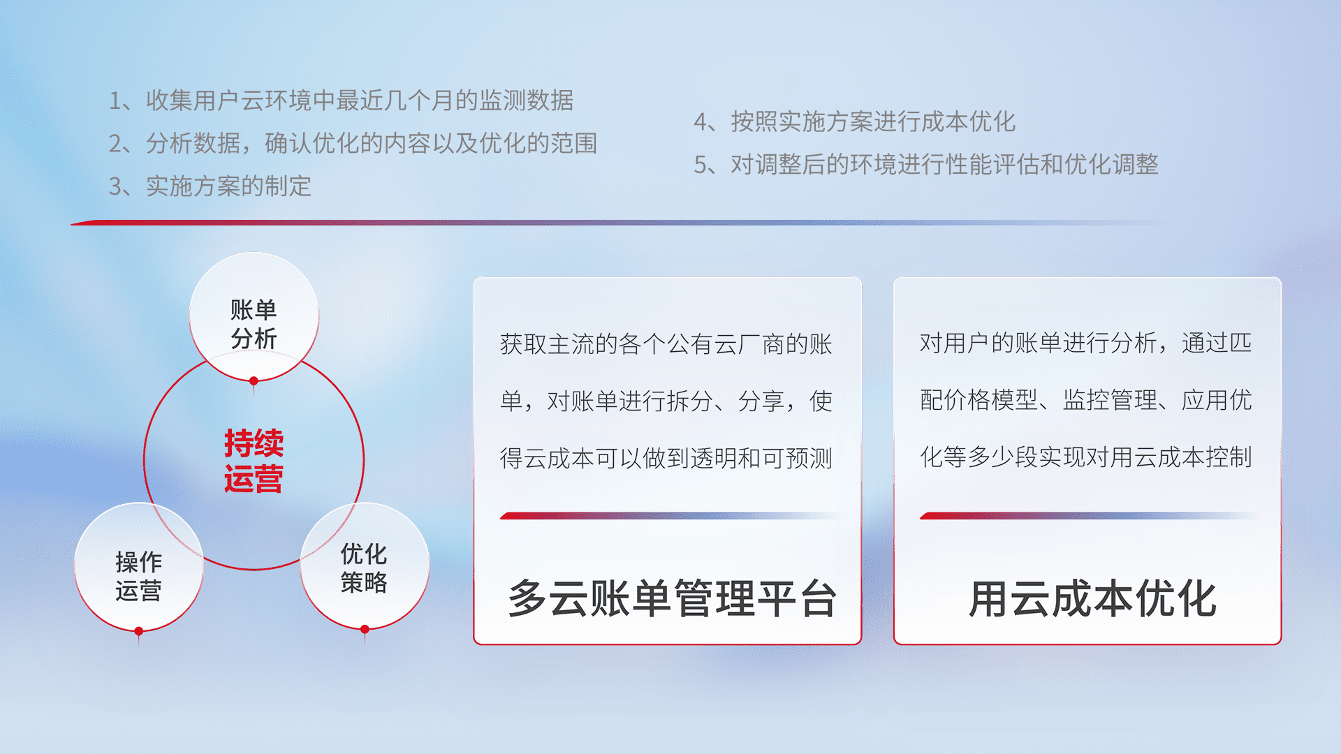 通过多云纳管,,,,以统一的资源数据模型把客户的云资源进行抽象和封装,,,进而实现对多云资源的统一操作,,,保障云资源管理的可靠性、、、稳定性与可用性。。量身定制化运维内容,,,,配置、、、、开发运维、、、、补丁管理、、、、备份、、、、监控、、、、认证和访问管理、、、、审计和日常巡检等,,,保障在用云过程中的可靠度,,稳定度以及高可用率。。。。